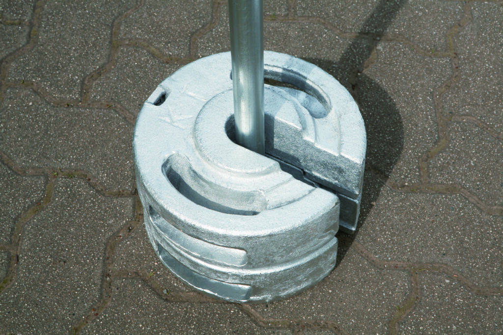 支柱にウェイト(重りを)使用することで急に風が吹いた時にテントが転倒したりするのを防ぐことが出来ます。鋳物や鉄製の20kgのものが一般的です。タンクに水などを入れて使用するタイプの物もあります。他にも地面が土の場合には杭とロープを使用して風対策をすることが出来ます。